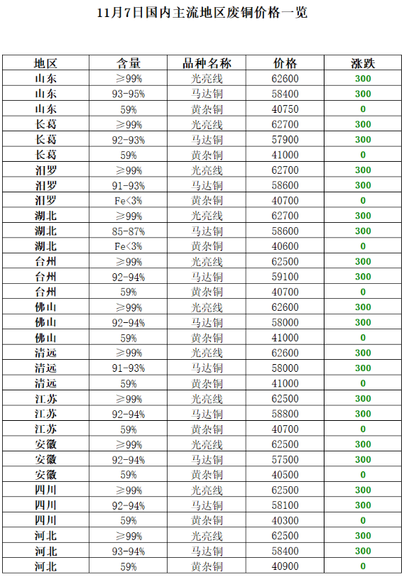 廢銅:今日(rì)中國(guó)再生(shēng)資源廢銅價格指數(shù)62611元/噸,較昨日(rì)上(shàng)漲300元/噸。11月(yuè)7日(rì),國(guó)內(nèi)現(£xiàn)貨銅成交區(qū)間(jiān)67960-68010元/噸,較上(shàng)一(yī)交易日(rì)價漲175元/噸,持貨商升貼水(s¶huǐ)對(duì)11月(yuè)b300-b350,升水(shuǐ)均值較上(shàng)一(yī)交易日(rì)漲55元/噸。上(shàng)午北(běi)方臨沂、保定和(hé)佛山(shān)貨場(chǎng)廢銅最高(gāo)報(bào)價清光(guāng)-合股采購(gòu)價在63000-63100元/噸,午間(jiān)盤中價格較上(shàngα)午下(xià)跌100元/噸,市(shì)場(chǎng)主要(yào)以寄存交易為(wèi)主,電(diàn)解銅升水(shuǐ)偏強,廢銅∏現(xiàn)貨邊際減少(shǎo),精廢價差1247元/噸價差,價差徘徊于合理(lǐ)線附近(jìn),再生(shēng)成交活躍度一(yī)般。≥近(jìn)期廢銅市(shì)場(chǎng)貨源相(xiàng)對(duì)穩定,企業(yè)采購(gòu)端成交尚可(kě),但(dàn)是(shì)下(xià)遊銅杆需求受行(xíng)情影(yǐng)響,成交心态較為(wèi)敏感。受需求端幹擾廢銅交易¥少(shǎo)有(yǒu)高(gāo)價,交投維持剛需。預計(jì)短(duǎn)期缺少(shǎo)單邊驅動因¶素,多(duō)因素博弈價格維持橫盤調整。