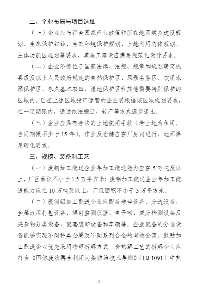 為(wèi)深入貫徹落實《中華人(rén)民(mín)共和(hé)國(guó)循環經濟促進法》《中華人(rén)民(m±ín)共和(hé)國(guó)固體(tǐ)廢物(wù)污染環境防治法》,引導廢銅、廢鋁加工(gōng)配送和(hé)利用(yòng)行(xín♦g)業(yè)高(gāo)質量發展,提高(gāo)精細化(huà)處理(lǐ)及直接利用(yòng)水(shuǐ)平,我部制(zhì)定了(le)《廢銅鋁加工(gōng)利用(yòng)行(xíng)業(yè)規範條件(jiàn)》,自(zì)2024年(nián)1月(yuè)1日(rì)起實施。