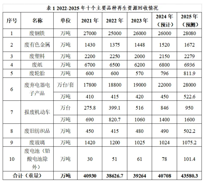 到(dào)2030年(nián),在全國(guó)範圍內(nèi),建成覆蓋資源全品類、産業(yè)全鏈條、城(chéng)鄉(xiāng)全覆蓋,線下(xià)以“交投點、中轉站(zhànα)、分(fēn)揀中心、加工(gōng)基地(dì)”為(wèi)網絡,線上(shàng)以信息化(huà)數(shù)字化(huà)平台為(wèi)支撐,布局合理(lǐ)、管理(lǐ)規範、運行( xíng)有(yǒu)序再生(shēng)資源回收體(tǐ)系。2030年(nián)主要(yào)資源産出率比2025年(n★ián)提高(gāo)約20%,廢鋼回收量達到(dào)33000萬噸,廢紙(zhǐ)回收量達到(dào)7600萬噸,廢有(yǒu)色金(jīn)屬回收量達到(dào)2100萬噸,φ廢塑料2900萬噸,再生(shēng)資源回收利用(yòng)行(xíng)業(yè)回收總量達到(dào)5.1億噸以上( shàng)。