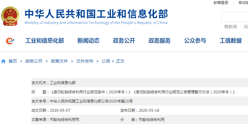 為(wèi)推動廢舊(jiù)輪胎綜合利用(yòng),引導行(xíng)業(yè)持續健康發展,現(xiàn)将《廢舊ε(jiù)輪胎綜合利用(yòng)行(xíng)業(yè)規範條件(jiàn)(2020年(nián)本)》和(hé)《廢舊(jiù)輪胎綜合利用(yòng)行(xíng)業(yè)規範公告管理(lǐ)暫行(xíng)辦法(2020年(nián)本)》予以公告。《輪胎翻新行(xíng)業(yè)準入條件(jiàn)》《廢輪胎綜合利用(yεòng)行(xíng)業(yè)準入條件(jiàn)》(中華人(rén)民(mín)共和(hé)國(guó)工(gōn"g)業(yè)和(hé)信息化(huà)部公告2012年(nián)第32号)、《廢舊(jiù)輪胎綜合利用(yòng)行(xíng)業(yè)準入公告管理(lǐ)暫行(xíng)辦法》(工(gōng)信≠部節〔2013〕86号)同時(shí)廢止。