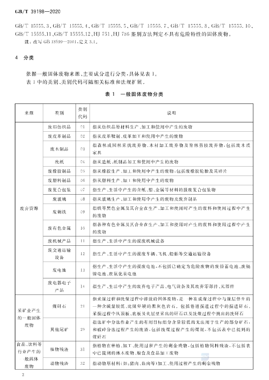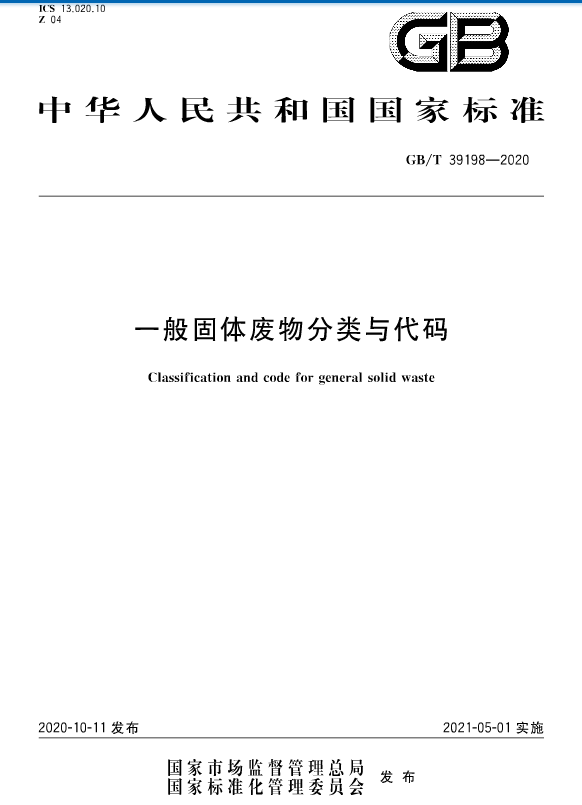 GB/T 39198-2020《一(yī)般固體(tǐ)廢物(wù)分(fēn)類與代碼》于2020年(nián)10月(yuè)11日(rì)經國(guó)家(jiā)市(shì)場(ch≈ǎng)監督管理(lǐ)總局(國(guó)家(jiā)标準化(huà)管理(lǐ)委員(yuán)會(huì))批準發布,自(zì)2021年(nián)5月(yuè)1日(rì)起實施。