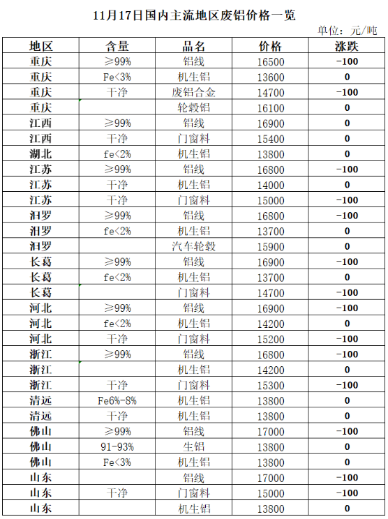 廢鋁:今日(rì)中國(guó)再生(shēng)資源廢鋁價格指數(shù)13847元/噸,較昨日(rì)持平。隔夜倫鋁高(gāo)開(kāi)後震蕩回落,尾盤收跌,盤終跌23.5美(měi)元/噸至2211.5美(měi)元/噸。滬鋁夜盤高(gāo)開(kāi)後震蕩下(xià)挫,主力近(jìn)月(yuè)≤重合跌110元/噸至18845元/噸。昨日(rì)廢鋁市(shì)場(chǎng)主流持穩,成交情況偏弱,貿易商采銷兩難,下(xià)遊需求表現(xiàn)相(xiàng)對(✔duì)偏弱。預計(jì)今日(rì)價格或窄幅下(xià)跌。