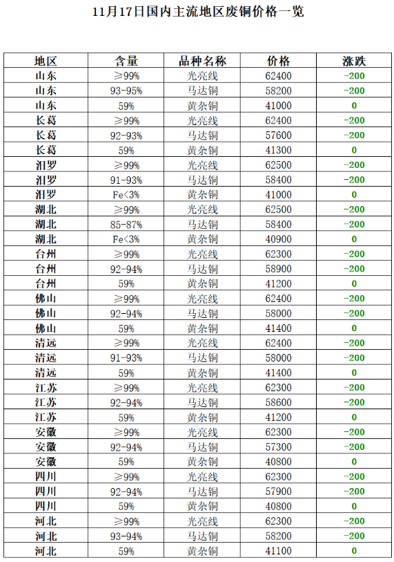 廢銅:今日(rì)中國(guó)再生(shēng)資源廢銅價格指數(shù)62391元/噸,較昨日(rì)下(xià)跌200元/噸。11月(yuè)17™日(rì),國(guó)內(nèi)現(xiàn)貨銅成交區(qū)間(jiān)68230-6833₩0元/噸,較上(shàng)一(yī)交易日(rì)價跌5元/噸,持貨商升貼水(shuǐ)對(duì)12合約b580-b680,升水(shuǐ)均值較上(shàng)一(yī)★交易日(rì)漲125元/噸。上(shàng)午北(běi)方臨沂、保定和(hé)佛山(shān)貨場(chǎng)廢銅最高(gσāo)報(bào)價清光(guāng)-合股采購(gòu)價在62900-63000元/噸,午間(jiān)盤中價格上(shàng)漲100元/噸,日(rì)內(nèi)廢銅貿易商出貨增多(☆duō),電(diàn)解銅升水(shuǐ)換月(yuè)結束,臨近(jìn)長(cháng)單簽訂現(xiàn)貨緊張升水(shuǐ)走強,廢銅現(xλiàn)貨流量增加,精廢價差擴大(dà)至1606元/噸價差,落于合理(lǐ)線上(shàng)方,再生(shēng)替代性增強。宏觀方面市(shì)場(chǎng)交易預期國(g uó)內(nèi)仍有(yǒu)消息落地(dì),基本面電(diàn)解銅升水(shuǐ)走強帶動,廢銅現(xiàn)貨價格高(gāo)位企穩,再生(shēn÷g)成交氛圍整體(tǐ)較好(hǎo),預計(jì)短(duǎn)期維持橫盤調整。