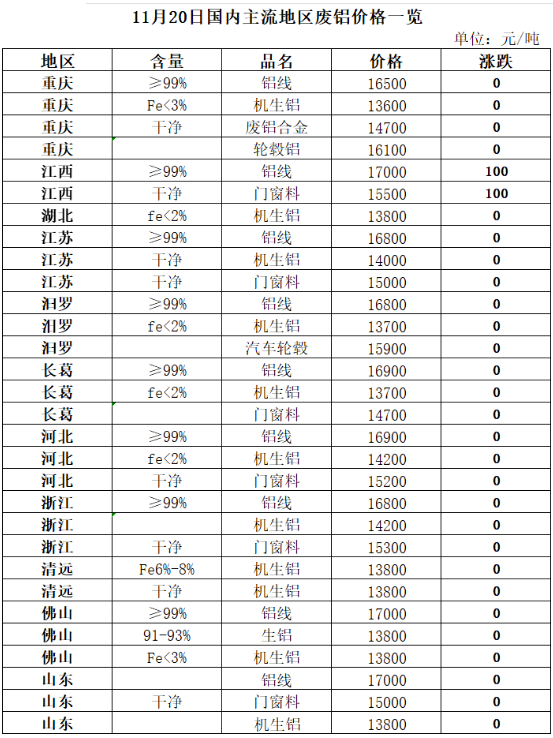 廢鋁:今日(rì)中國(guó)再生(shēng)資源廢鋁價格指數(shù)13847元/噸,較昨日(rì)持平。¥上(shàng)周五倫鋁開(kāi)盤後震蕩承壓,而後穩中回漲,盤終漲4.5美(měi)元/噸至2216美(měi)元/噸。滬鋁夜盤開(kāi)盤下(xià)挫後弱勢震蕩,主β力近(jìn)月(yuè)重合跌45元/噸至18825元/噸。周末廢鋁市(shì)場(chǎng)主流持穩,市(shì)場(chǎng)成交情況偏₽弱,觀望為(wèi)主。預計(jì)今日(rì)價格或偏弱運行(xíng)。