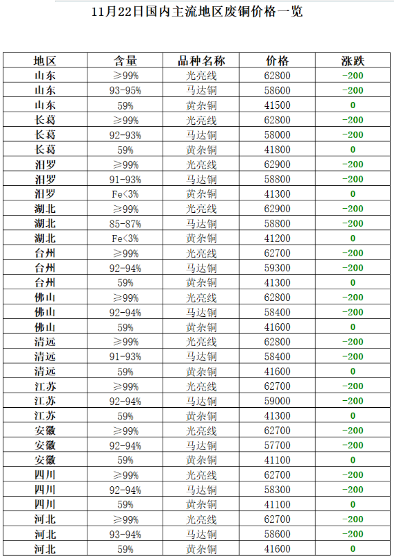 廢銅:今日(rì)中國(guó)再生(shēng)資源廢銅價格指數(shù)62791元/噸,較昨日(rì)下(xià)跌200元/噸₽。11月(yuè)22日(rì),國(guó)內(nèi)現(xiàn)貨銅成交區(qū)間(jiān)68510-68560元/噸,較上(shàng)一(yī)交易日(rì)價跌4€35元/噸,持貨商升貼水(shuǐ)對(duì)12合約b300-b350,升水(shuǐ)均值較上(shàng)一(y<ī)交易日(rì)跌435元/噸。上(shàng)午北(běi)方臨沂、保定和(hé)佛山(shān)貨場(chǎng)廢銅最高(gāo)報(bào)價清光(g≤uāng)-合股采購(gòu)價在63300-63400元/噸,午間(jiān)盤中價格下(xià)跌200元/噸。電(diàn)解銅由于進口貨源流入,現(xiàn)貨升水(shu®ǐ)走弱,廢銅現(xiàn)貨流量尚可(kě),精廢價差收窄至1702元/噸,落于合理(lǐ)線上(shàng)方,再生(shēng)替代性強。宏觀方面美(měi)σ聯儲會(huì)議(yì)紀要(yào)顯示,當前市(shì)場(chǎng)通(tōng)脹仍處于相(xiàng)對(duì)高(≤gāo)位,年(nián)底有(yǒu)可(kě)能(néng)結束加息但(dàn)是(shì)降息至少(shǎo)要(yào)等到(dào)明(mín'g)年(nián)6月(yuè),而且需要(yào)依托“全部數(shù)據”做(zuò)出判斷。消息面相(xiàng)對(duì)溫和(hé),現(x"iàn)貨市(shì)場(chǎng)高(gāo)價抑制(zhì)市(shì)場(chǎng)需求,短(duǎn)期廢銅價格亦承壓,預計(jì)沖高(gāo)乏力再度震蕩整理←(lǐ)。