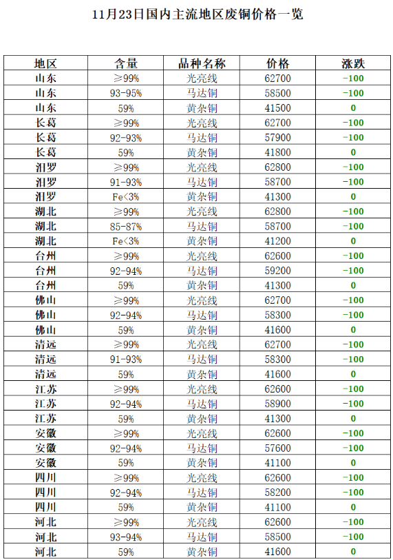 廢銅:今日(rì)中國(guó)再生(shēng)資源廢銅價格指數(shù)62691元/噸,較昨日(rì)下(xià)跌100元/噸。11月(yuè)23日(rì),國(guó)內(nèi)現(xiàn)貨銅成交區(qū)間(jiān)68430-68480元/噸,較上(shàng)一(yī)交易日(rì)價跌80元/噸,持∞貨商升貼水(shuǐ)對(duì)12合約b350-b400,升水(shuǐ)均值較上(shàng)一(yī)交易日★(rì)漲50元/噸。上(shàng)午北(běi)方臨沂、保定和(hé)佛山(shān)貨場(chǎng)廢銅最高(gāo)報(bào)價清光(g£uāng)-合股采購(gòu)價在63100-63200元/噸,午間(jiān)盤中價格下(xià)跌100元/噸。電(diàn)解銅庫存偏低(dī)供應緊張,₹升水(shuǐ)回升,廢銅現(xiàn)貨流量有(yǒu)所減少(shǎo),精廢價差收窄至1675元/噸,落于合理(lǐ)線上(sh₩àng)方,再生(shēng)替代性強。成交方面由于價格回落,下(xià)遊利廢企業(yè)反饋廢銅¶難收,而且當前部分(fēn)企業(yè)選擇降低(dī)庫存,廢銅訂單一(yī)般;下(xià)遊銅杆價格過高(gāo)抑制(zhì)需求,整體(tǐ)表現(xiàn)供需兩弱。