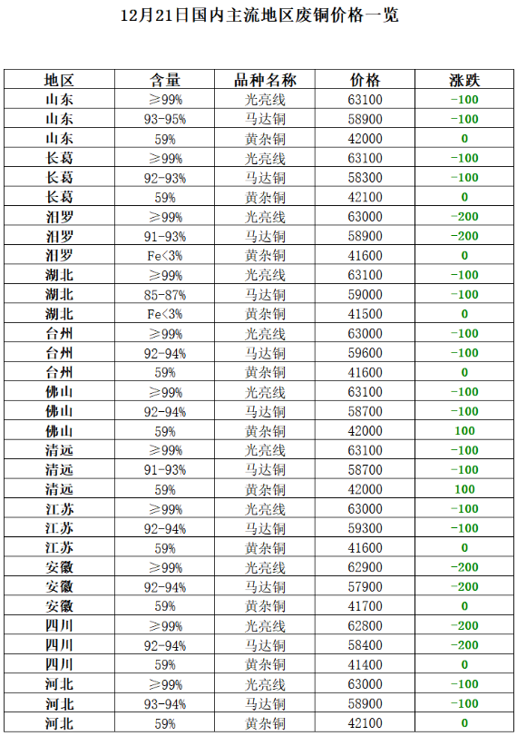 廢銅:今日(rì)中國(guó)再生(shēng)資源廢銅價格指數(shù)63059元/噸,較昨日(rì)下(xià)跌112元/噸。12月(yuè)21日(rì),國(guó)內(nèi)現(xiàn)貨銅成交區(qū)間(jiān)69110—69160元/噸,較上(shàn g)一(yī)交易日(rì)價跌90元/噸,持貨商升貼水(shuǐ)對(duì)2401合約b250-b300,升水(sh>uǐ)均值較上(shàng)一(yī)交易日(rì)10元/噸。上(shàng)午北(běi)方臨沂、保定和(hé)佛山(shān)貨場(chǎng)廢銅最高( gāo)報(bào)價清光(guāng)-合股采購(gòu)價在63500-63600元/噸較上(shàng)一(yī)交易日(rì)下(xi©à)跌100元/噸,午間(jiān)市(shì)場(chǎng)價格随行(xíng)持平。電(diàn)解銅貨源緊張升水(shuǐ)處于ε高(gāo)位,廢銅現(xiàn)貨供應尚可(kě),精廢價差2058元/噸,替代性偏強。成交方面,盤中價格處于高(gāo)位震蕩,受看(kàn)漲情緒影(yǐng)響持貨商與下(xià)>遊加工(gōng)企業(yè)議(yì)價僵持,部分(fēn)企業(yè)采購(gòu)價格被迫與昨日(rì)持平。下§(xià)遊銅杆訂單并不(bù)理(lǐ)想,因此少(shǎo)數(shù)企業(yè)暫停報(bào★)價,再生(shēng)市(shì)場(chǎng)成交較為(wèi)清淡。