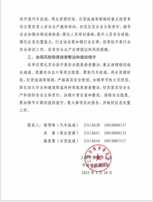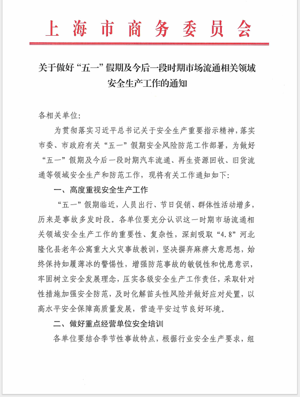 關于做(zuò)好(hǎo)“五一(yī)”假期及今後一(yī)段時(shí)期市(shì)場(ch☆ǎng)流通(tōng)相(xiàng)關領域安全生(shēng)産工(gōng)作(zuò)的(de)通(tōng)知(zhī)
