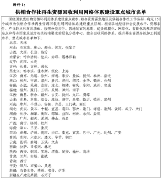 圍繞國(guó)家(jiā)廢舊(jiù)物(wù)資循環利用(yòng)體(tǐ)系建設重點城(chéng)市(shì),結合資源富集地(d ì)區(qū)及供銷合作(zuò)社工(gōng)作(zuò)實際,确定150個(gè)城(chéng)市(shì)為(wèi)供銷合作(zuò)社再生(shēng)資源回收φ利用(yòng)網絡體(tǐ)系建設重點區(qū)域(見(jiàn)附件(jiàn)1),加快(kuài)實施“五大(dà)行(xíng)動”,即中♠再生(shēng)集團核心功能(néng)提升行(xíng)動、骨幹企業(yè)梯度培育行(xíng)動、省域網絡建設行(xíng)動、區(q≤ū)域協同發展行(xíng)動、數(shù)字化(huà)賦能(néng)增效行(xíng)動;全面推進>“815”工(gōng)程,即培育壯大(dà)80餘家(jiā)全資控股骨幹企業(yè)、建設10000 個(gè)标準化¶(huà)規範化(huà)回收站(zhàn)點、打造500個(gè)綠(lǜ)色分(fēn)揀中心(見(jiàn)附件(jiàn)2),形成供 銷合作(zuò)社再生(shēng)資源回收利用(yòng)網絡體(tǐ)系高(gāo)質量發展格局。(見(jiàn)圖1略)
