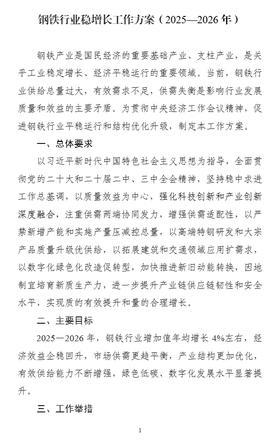 現(xiàn)将《鋼鐵(tiě)行(xíng)業(yè)穩增長(cháng)工(gōng)作(zuò)方案(2025—2026年(nián))》印發給你(nǐ)們,請(qǐng)結合實際認真抓好(hǎo)落實。